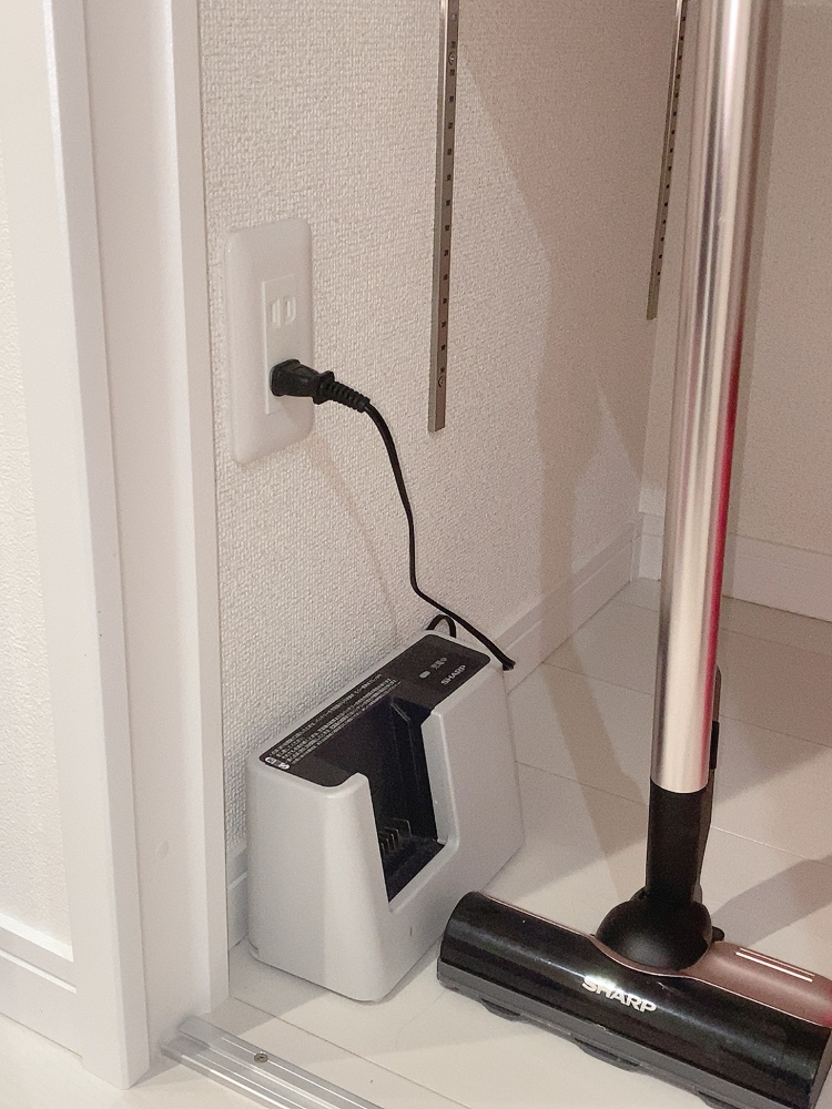 我が家では、掃除機の充電をこのように常に付けているのでリビング収納にコンセントを付けて本当に良かったです。